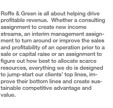 ![]() WHAT WE DOFix Chronic Business Problems that Impede GrowthWe get calls when opportunities or problems that keep coming up must finally really be addressed. Perhaps you don't have the internal time or expertise, or things have become more painful. Or you are contemplating a transaction. Or you are just tired of seeing the opportunities slip by and keep showing up on your to-do list. Whether marketing, sales, business development/expansion or planning and the accompanying operational issues, if they are sticky, we love to tackle them. Jump-Start Revenue by Finding Low Hanging FruitOur clients often have untapped opportunities to generate revenue quickly that they either didn't have the time or people to address or they just didn't see. Capitalizing on this low-hanging fruit in the sales and marketing arenas can often buy time to address the other opportunities that take longer to develop and incubate. Plan And Execute New Avenues of GrowthWhile our clients are busy addressing the needs of existing businesses, product lines and customers and assuring the preservation of the business they fought hard to develop, we supplement their activities. Addressing opportunities and bringing our expertise to bear in helping improve their speed to market. Our activities run the gamut from launching new businesses to geographic, trade class or target audience expansion. Provide Interim Management to Repair and Grow Existing BusinessesFrequently our clients lack the internal expertise needed to solve a problem or capitalize on opportunities. Often they do not want to or cannot add overhead. So, we address a defined activity, for a defined result and time. Often carrying a business card as a senior member of our clients' management. Some clients faced an immediate need -- generally created by promotion, resignation, health related issues or peaks of activity -- until new senior management could be hired or the company sold. Or assignments were dictated by the need to capitalize on opportunities or improve operations prior to a sale or capital raise. And sometimes clients needed help defining the characteristics required for a successful candidate. Working all over the U.S., Canada, Europe and Asia, from two days a week to seven, we have been transplanted and we have commuted, depending on what is best for the business. Our assignments as C-level interim managers (generally CEO, COO, or head of marketing, sales or business development) have lasted between 6 and 27 months. And, when done, we assure a smooth transition and turn the business back in better condition than when we received it. Harness the power of third parties to accelerate growth.